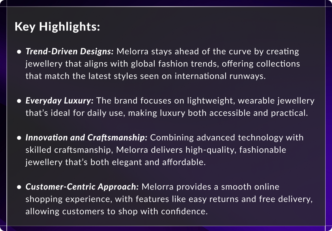 Melorra is transforming the jewellery market with its modern and trend-inspired designs, making fine jewellery an everyday choice. Founded with the goal of bridging the gap between high fashion and fine jewellery, Melorra offers pieces that complement the contemporary woman’s wardrobe.