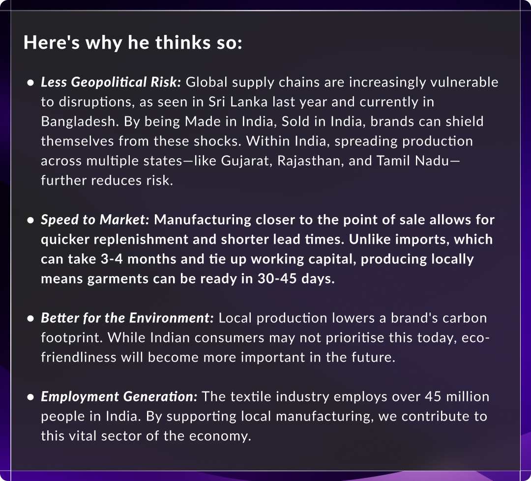 He said, "While countries like China, Vietnam, Sri Lanka, and Bangladesh have their roles in global manufacturing, I believe that the best path for Indian brands to grow is to Make in India, for India.”