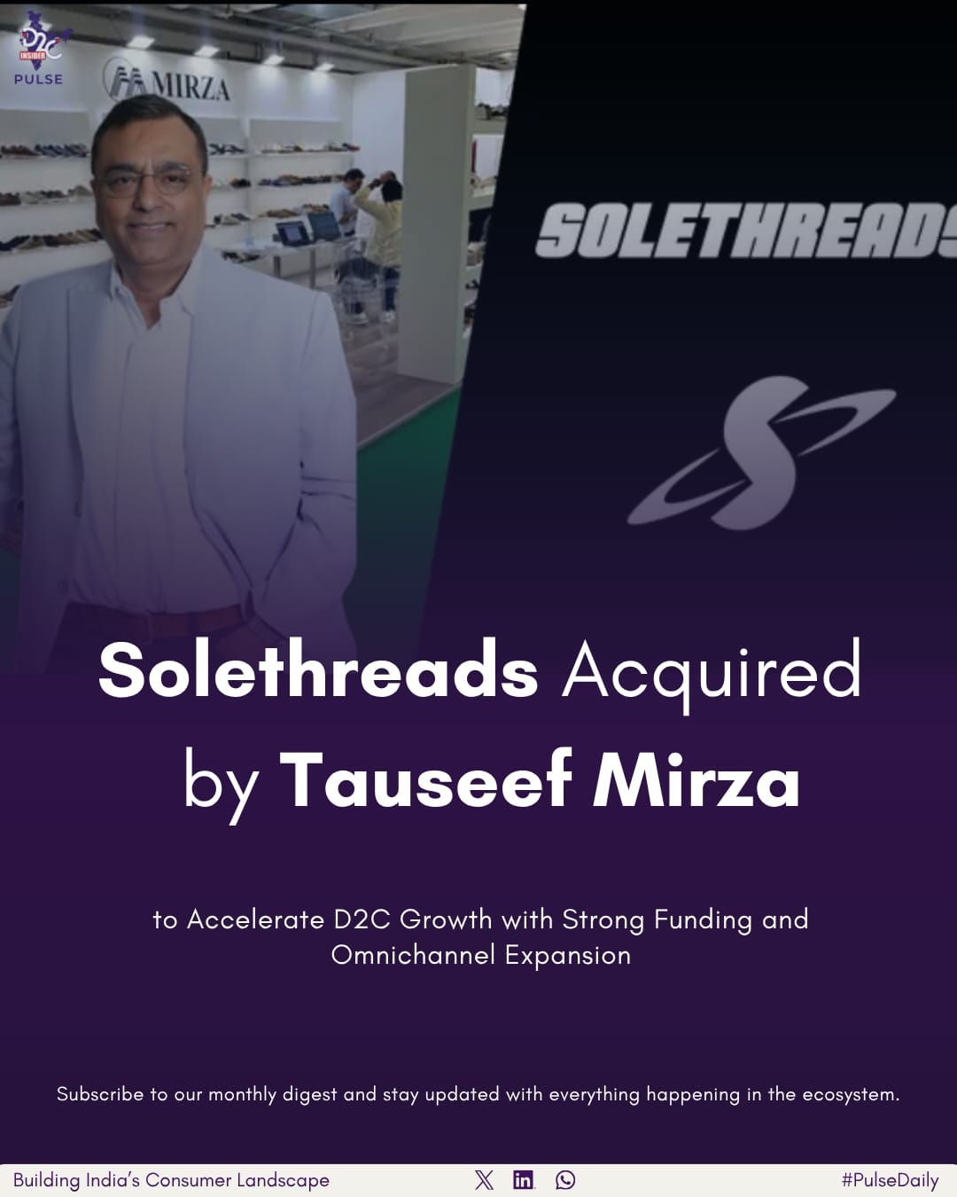 1. Solethreads has been acquired by Tauseef Mirza, accelerating its D2C growth with strong funding, ₹6 crore monthly run rate, and omnichannel expansion plans.