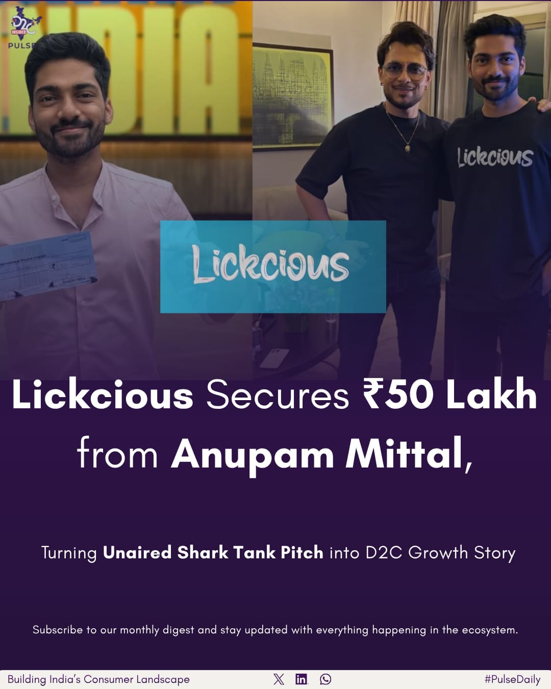 3.Lickcious raises ₹50 lakh from Anupam Mittal, turning an unaired Shark Tank pitch into a strong D2C growth and storytelling moment.