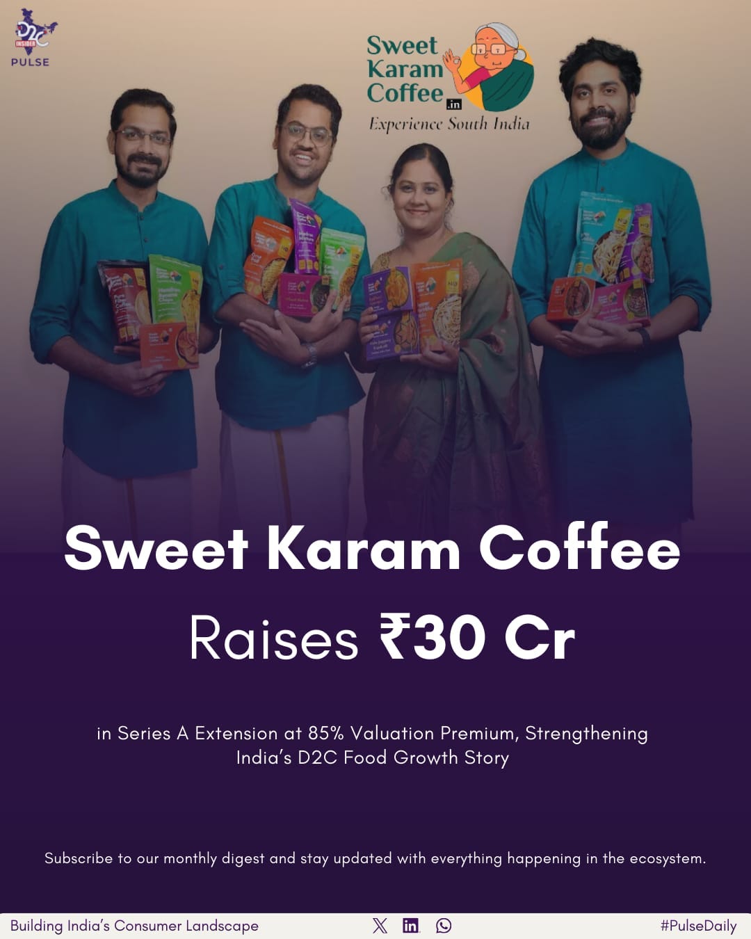 In the latest D2C news India spotlighting strong investor conviction in regional food brands, South Indian food startup Sweet Karam Coffee (SKC) is set to raise ₹30 crore (approximately $3.31 million) in a Series A extension round from existing investors Peak XV Partners and Fireside Ventures. The fresh capital comes at an 85% valuation premium, marking a significant milestone in D2C funding rounds and reinforcing momentum in India’s fast-growing D2C food and beverage brands segment.