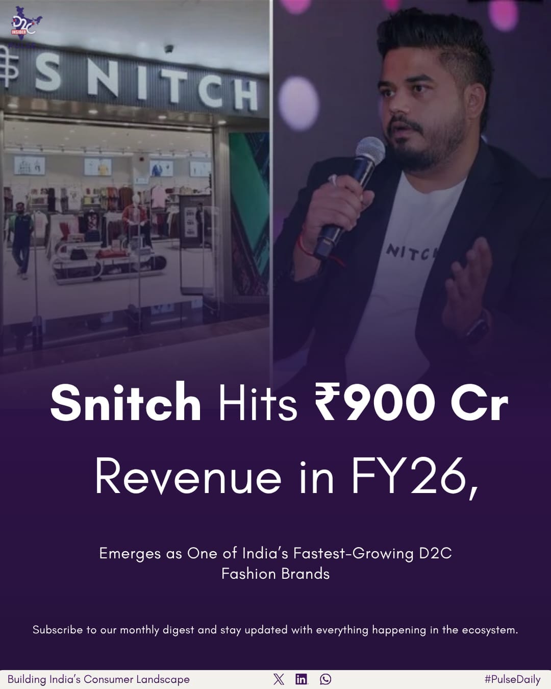 3. Snitch clocks ₹900 Cr revenue in FY26 with 80% growth, driven by omnichannel expansion and quick commerce innovation. With strong offline momentum, lifestyle category expansion, and a ₹1,400 Cr FY27 target, the brand is emerging as one of India’s fastest-growing D2C fashion players.