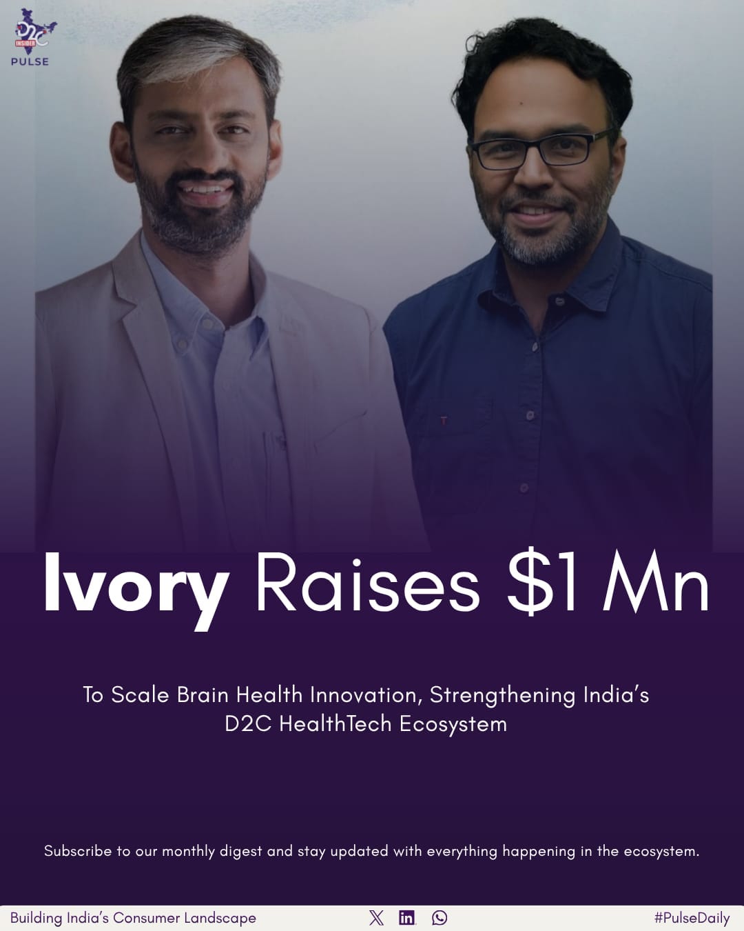 2. Ivory raises $1 Mn in seed funding to scale its brain health platform, focusing on early detection and cognitive care. With strong investor backing, tech innovation, and healthcare partnerships, the startup is rapidly emerging as a key player in India’s growing D2C healthtech and wellness ecosystem.