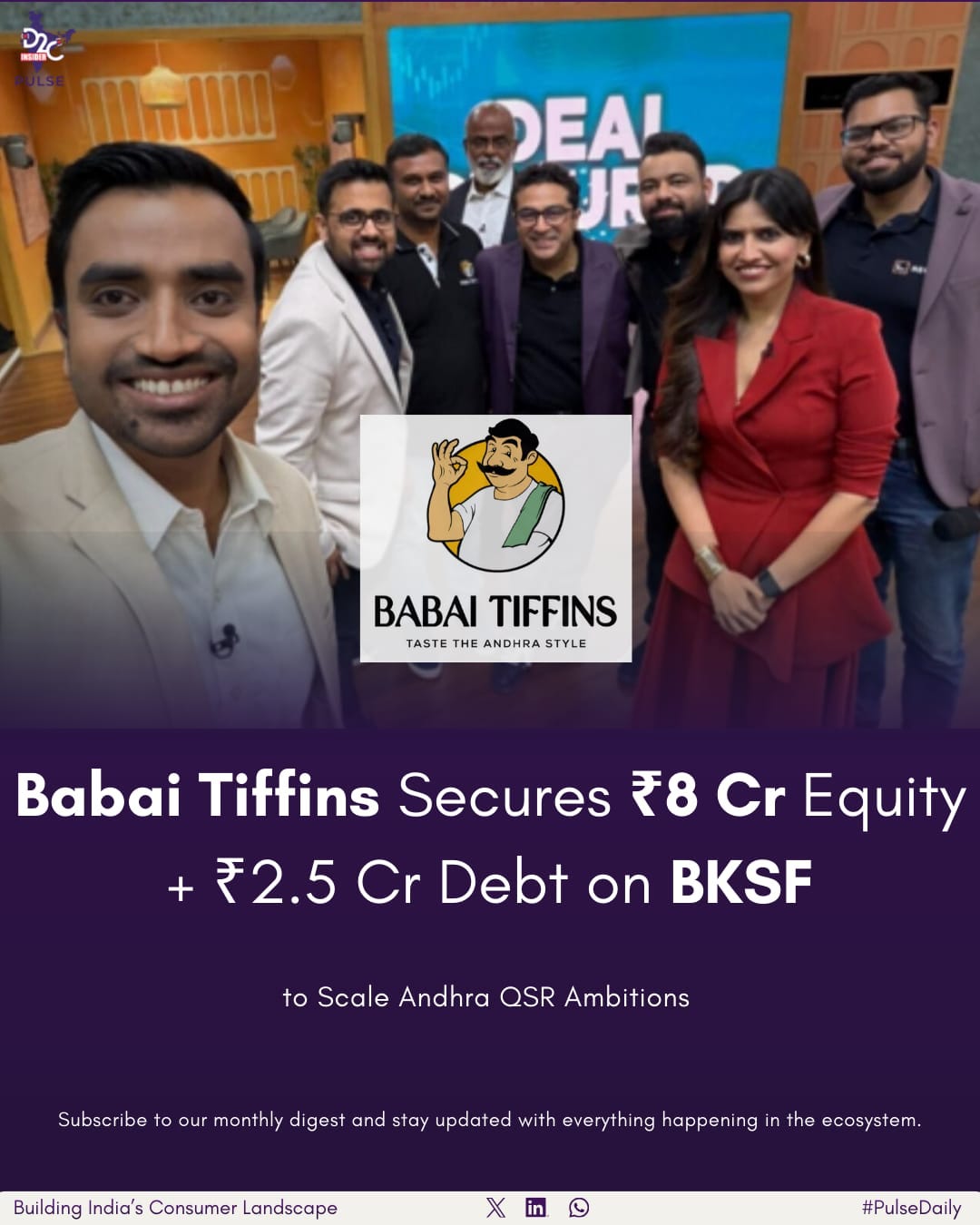 Andhra-based quick service restaurant (QSR) brand Babai Tiffins LLP has secured ₹8 crore for 10% equity along with ₹2.5 crore in venture debt after appearing on Bharat Ke Super Founders (BKSF), marking a strong validation moment for regional food brands in India’s fast-evolving D2C ecosystem India. The funding positions Babai Tiffins among the most notable names in recent D2C startup news and underlines growing investor interest in scalable, culture-first food businesses.