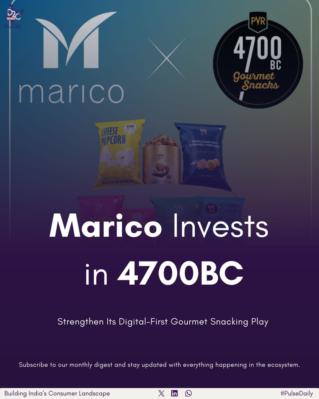 Marico has announced a strategic investment in 4700BC, one of India’s most recognised premium gourmet snacking brands, marking a significant step in expanding its digital-first foods portfolio. The move brings 4700BC into the Marico Digital family, reinforcing the FMCG major’s focus on high-growth, value-added food categories within India’s rapidly evolving direct-to-consumer (D2C) ecosystem