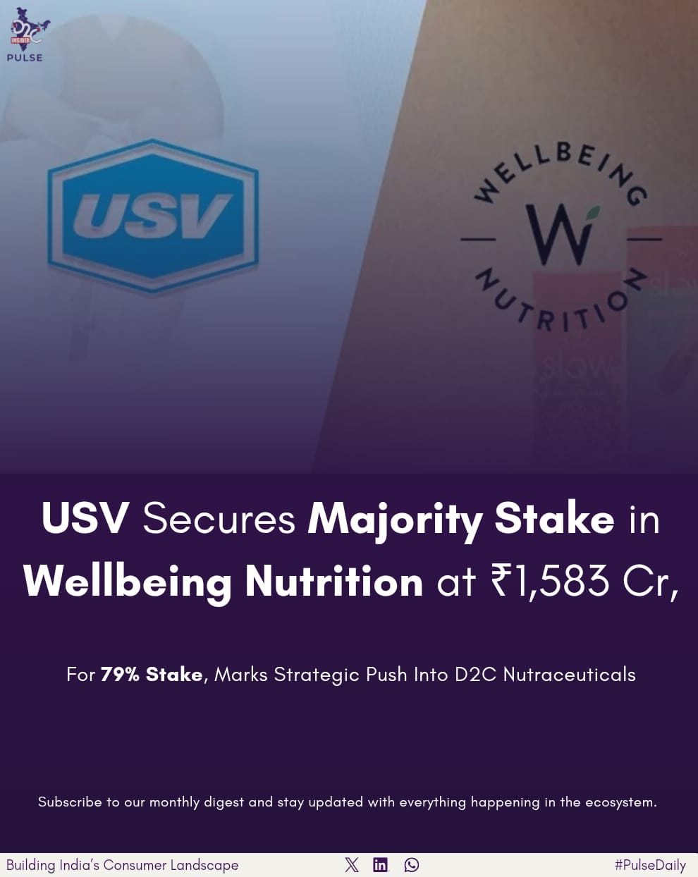 In one of the most significant D2C acquisitions 2025 and major highlights in D2C news India, pharmaceutical major USV has signed a definitive agreement to acquire a 79% stake in Nutritionalab Private Limited, the parent company of Wellbeing Nutrition. The transaction values the Direct-to-consumer India nutraceutical brand at approximately ₹1,583 crore, marking a strong moment in India’s D2C ecosystem India and reinforcing the growing momentum in D2C industry news.